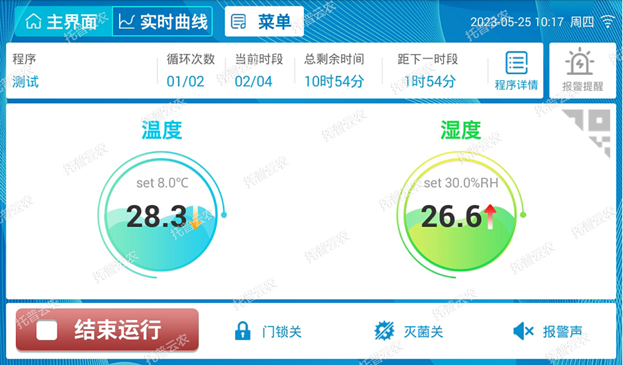 運行狀態:可查看溫度、濕度,程序、循環次數、時段、剩余時間等。